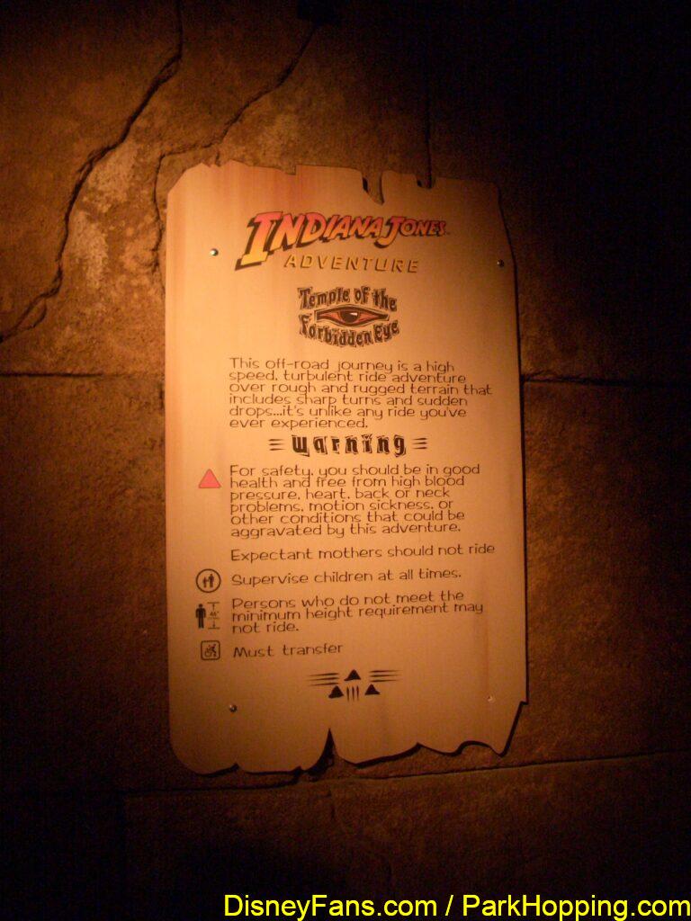 Well, we are on a quest today… Disneyland’s Indiana Jones Adventure has a warning sign just before you turn to go up the stairs over to the other side of the ride track to board. It was a nice, authentic looking wooden sign, but it did not last. Within a few years of opening, the sign was replaced with a mode modern-looking sign with lots of extra warnings. Here is a photo of the updated sign from 2003: